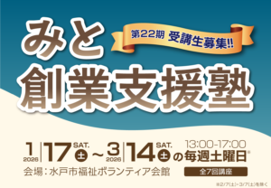 「第22期 みと創業支援塾」の開催が決定しました。 2025.10.23 みと創業支援塾事務局からご案内申し上げます。 このたび「第22期みと創業支援塾」の開催が決定いたしました。 こちらは、2026年1月より開講する全7回講座で、 応募受付は2025年11月11日(火)より開始いたします。 水戸市内で起業や創業、事業の拡大をお考えの方は、 ぜひ「みと創業支援塾」をご検討ください。 みと創業支援塾事務局